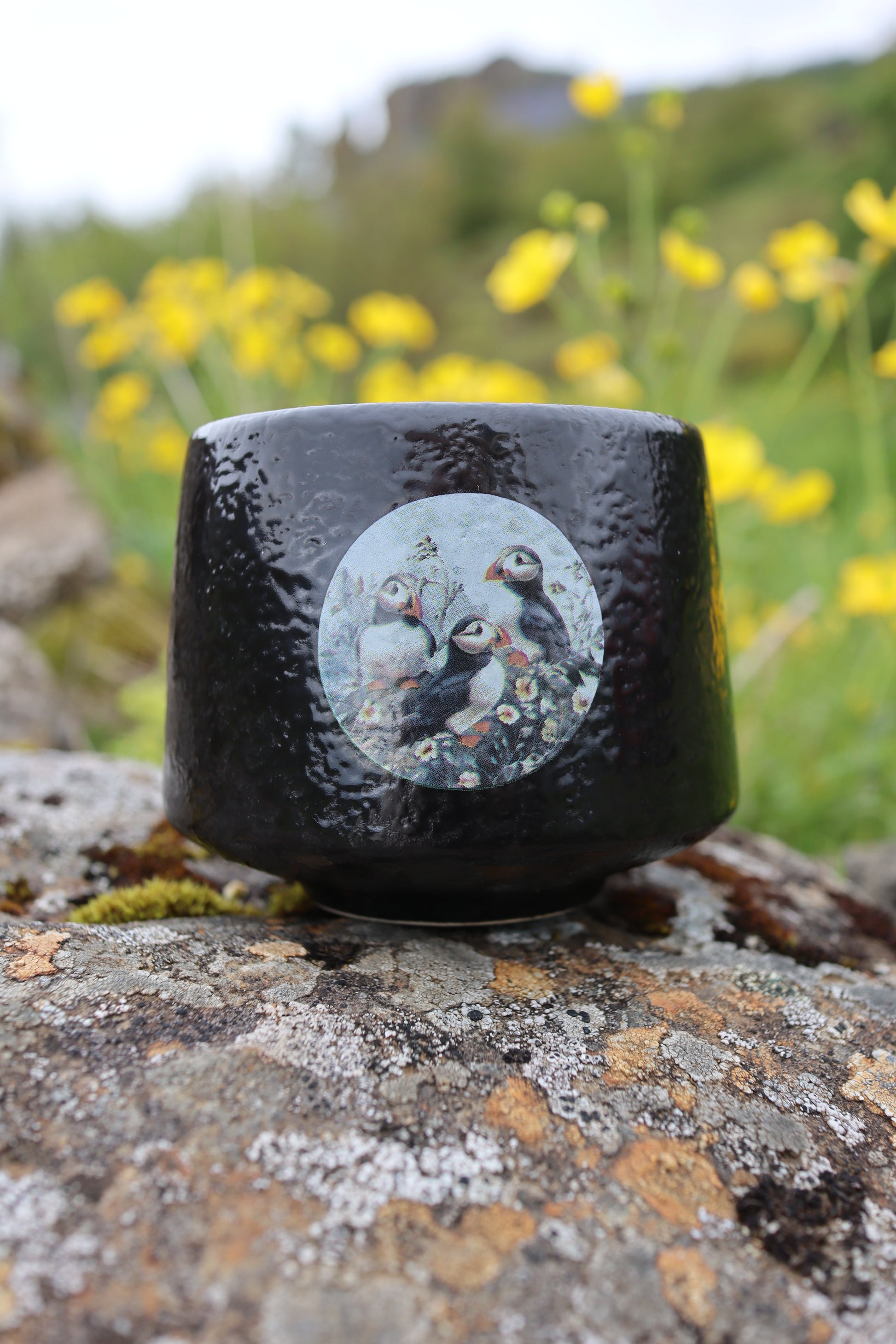 • Black ceramic mug featuring a beautiful puffin design surrounded by wildflowers.