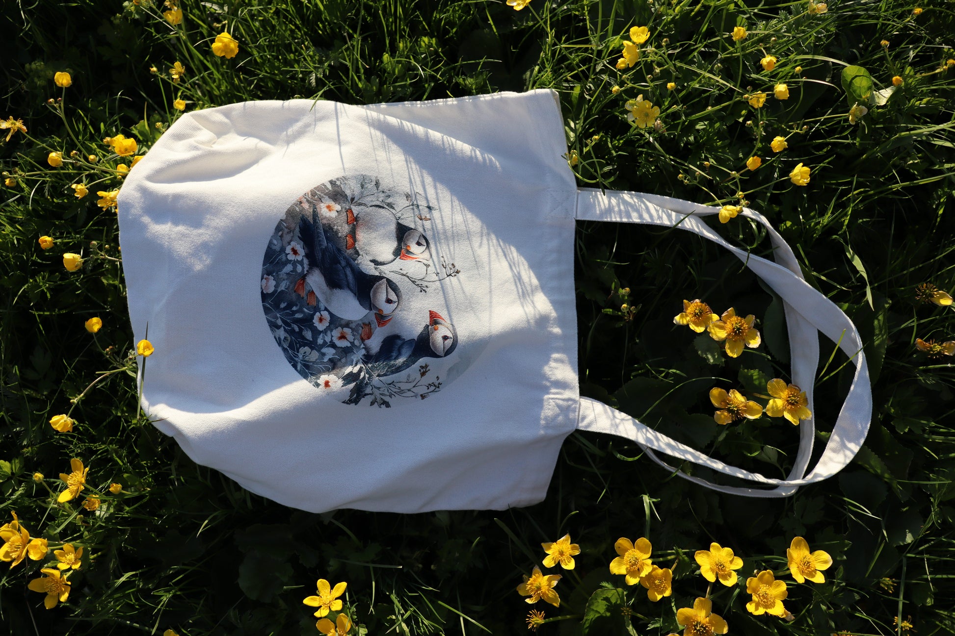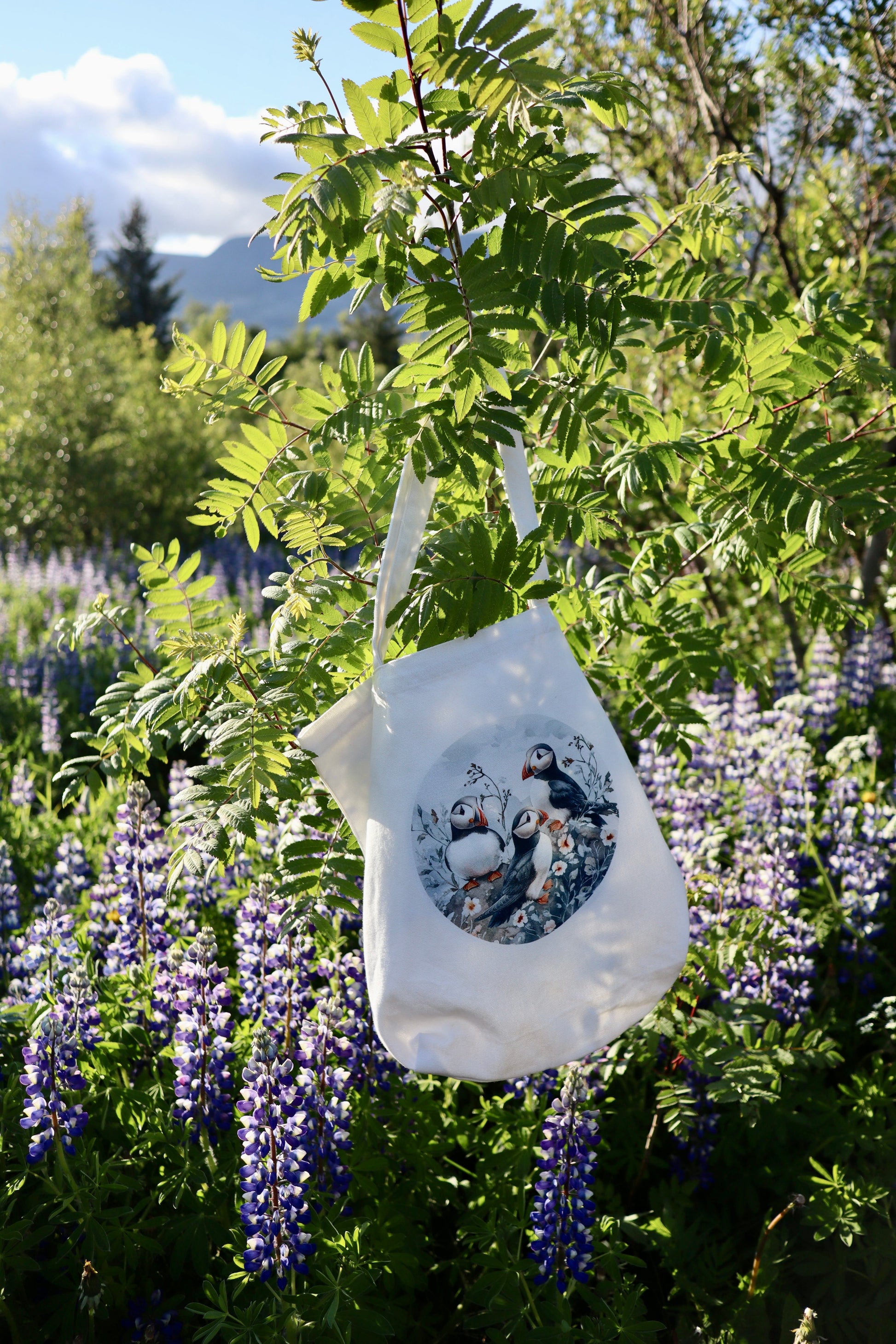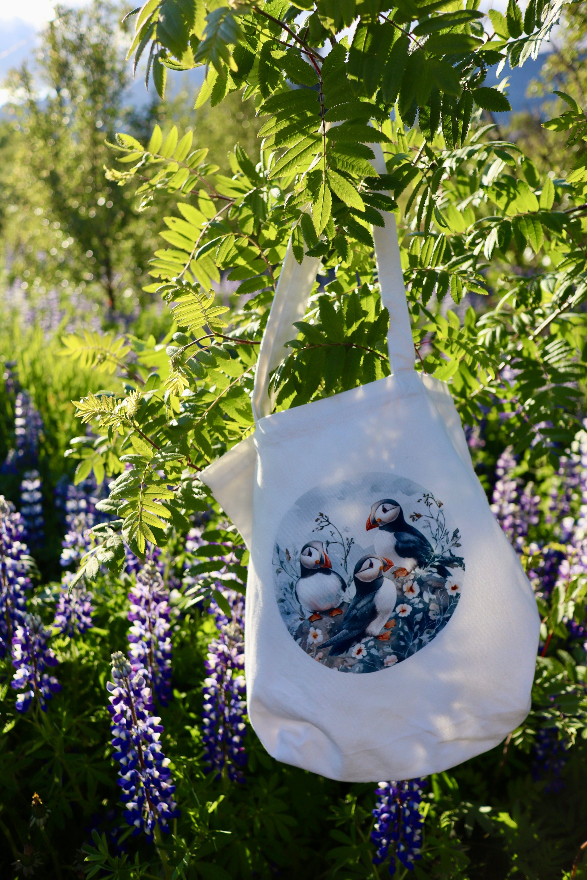 • Tote bag made from 100% organic cotton, featuring a design of three puffins among wildflowers.